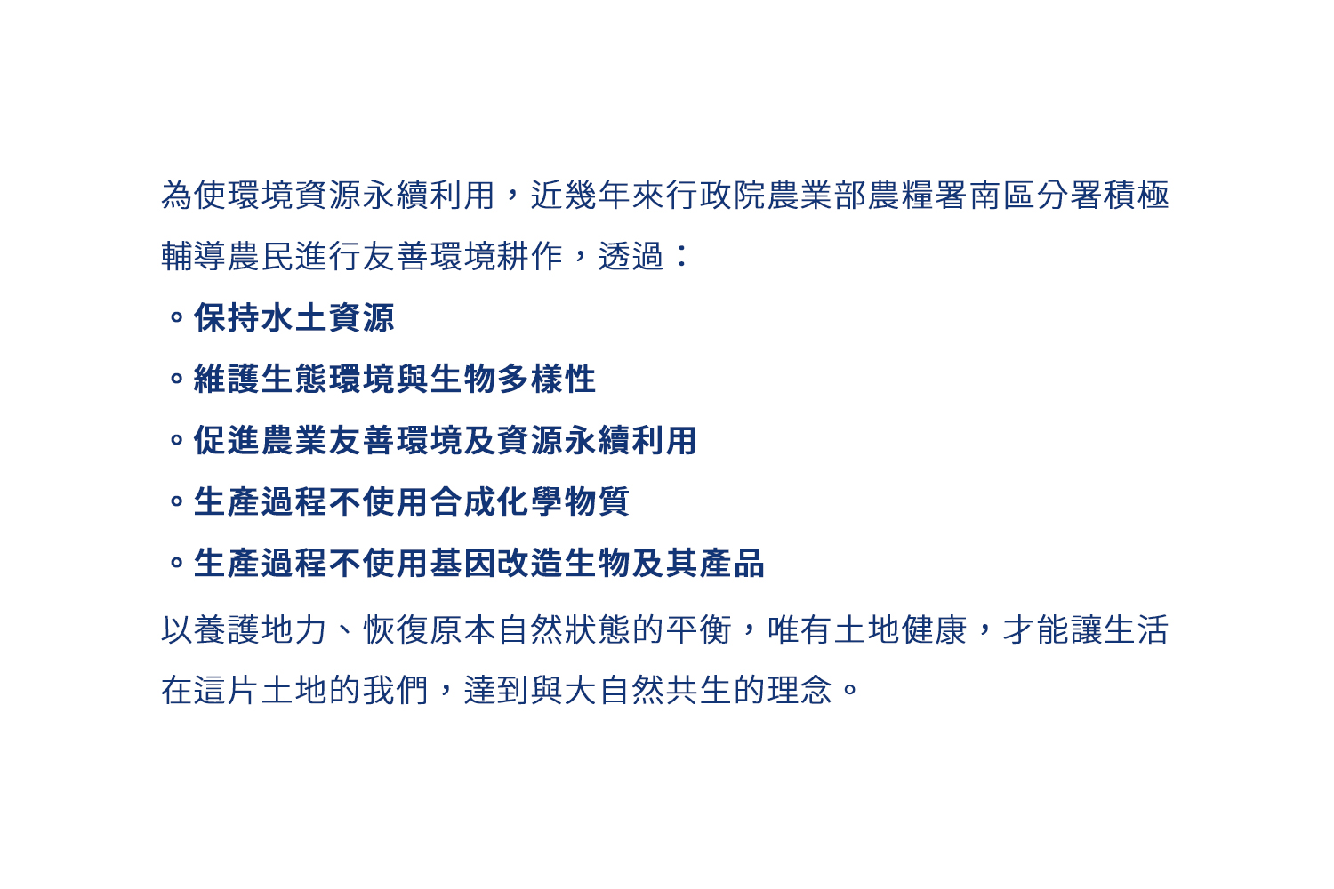 我們不任意開發土地,不使用化工農藥與肥料,讓作物無憂無慮的生長,一點一滴讓大地萬物藉由其原生的營養而成長,讓土地恢復自然的狀態,創造永續的生態環境。