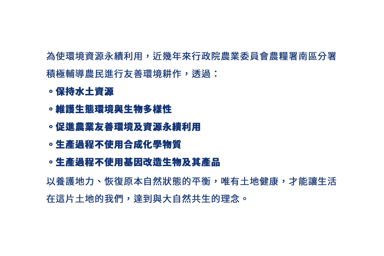 我們不任意開發土地,不使用化工農藥與肥料,讓作物無憂無慮的生長,一點一滴讓大地萬物藉由其原生的營養而成長,讓土地恢復自然的狀態,創造永續的生態環境。
